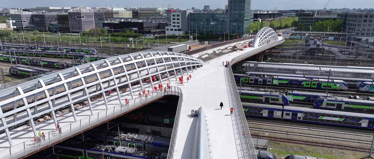 Le Franchissement Urbain Pleyel, ici pendant les travaux de finition au printemps 2024, enjambe les 48 voies ferrés du réseau nord-parisien, reliant ainsi les quartiers Pleyel et Landy France à Saint-Denis. Crédit : Franck Badaire / SPL Plaine Commune Développement