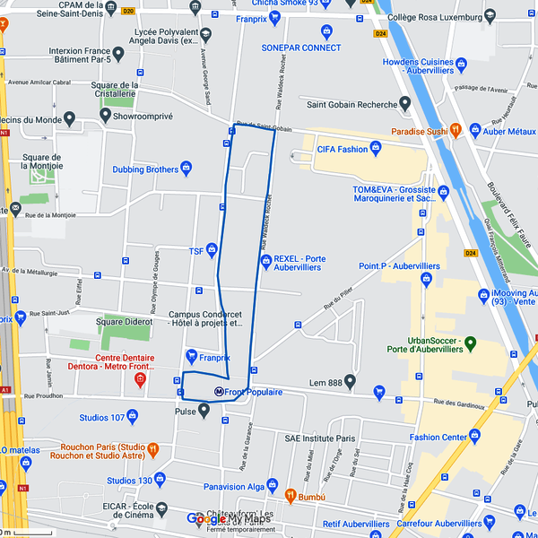 Et pour cause, le point de départ du parcours se situe sur la place du Front Populaire à Saint-Denis, où trônent les 30 000 mètres carrés de bureaux de l’immeuble Pulse, devenu en janvier 2021 le quartier général et cœur battant des équipes de Paris 2024. Une fois cette balade d’un peu moins de 2 km débutée, vous vous dirigerez vers le site du Campus Condorcet à Aubervilliers, l’un des principaux campus de recherche et de formation en sciences humaines et sociales à l’échelle européenne. L’itinéraire forme une boucle autour du campus pour revenir en fin de parcours sur la place du Front Populaire.