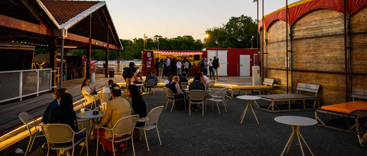 Terrasse derrière le chapiteau du Fort, à la tombée du jour. ©Fabrice Gaboriau / Plaine Commune