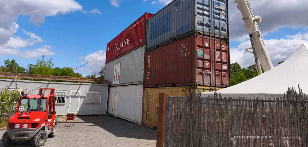 L'ensemble de containers, positionnés entre le chapiteau et la halle du Point Fort, un mur antribruit, démontable et réutilisable pour limiter les nuisances sonores du lieu. / Crédit photo : Le Point Fort d'Aubervilliers.