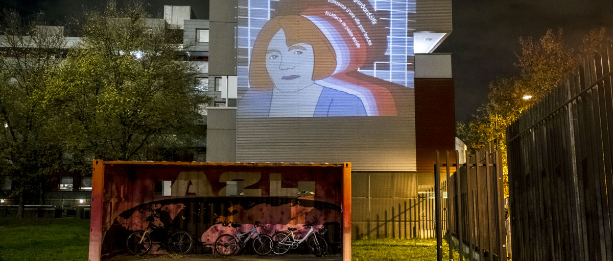 Projection d'une œuvre lumineuse sur un immeuble de la rue Pablo Neruda à Villetaneuse. @Simon Lambert
